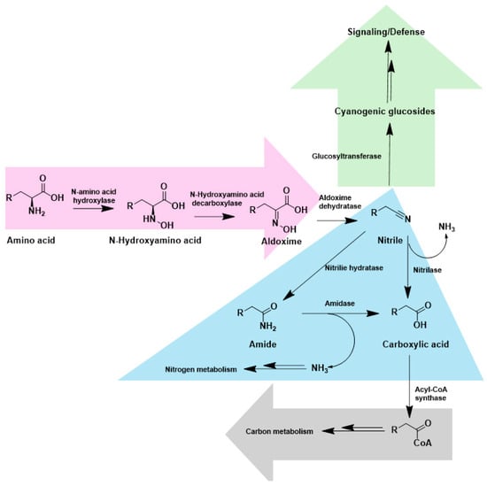 Aldoxime–nitrile pathway in microbes and plants, and the downstream metabolism of nitriles. Nitrilase directly hydrolyses nitriles produced in this pathway to carboxylic acids and ammonia. NHase catalyses the hydration of nitriles to amides, which are subsequently converted to carboxylic acids and ammonia by an amidase enzyme.