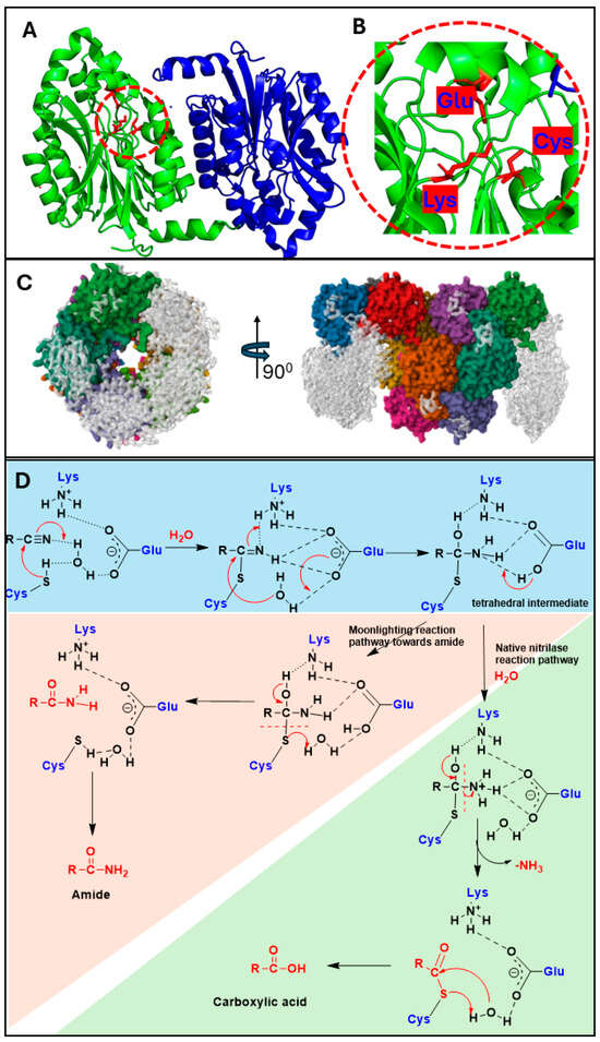 The nitrilase enzymes typically feature a conserved Glu-Lys-Cys catalytic triad and adopt a characteristic four-layered α-β-β-α sandwich fold (Figure 2A,B). The residues present in the α-β-β-α fold often play a role in protein interactions by forming dimers, which in turn assemble into larger oligomeric structures (Figure 2C) [,]. Cyanide-converting enzymes such as cyanide dihydratase and cyanide hydratase, detoxify HCN into formate and formamide, respectively, also belonging to the nitrilase superfamily as well. They share a conserved Glu–Lys–Cys catalytic triad, along with additional conserved flanking residues that support their classification as specialised nitrilase variants acting on free cyanide []. Nitrilases uniquely catalyse the direct hydrolysis of nitriles, without producing intermediate amides, via a covalent thiol-mediated catalysis. However, the promiscuous amide formation activity was also reported in nitrilases towards benzylic nitriles and other aromatic nitriles substituted with electron-withdrawing groups (Figure 2D) [,]. This moonlighting activity was further improved by the site-directed mutagenesis of non-polar amino acid residues that stabilise the native tetrahedral intermediate during catalysis [,]. The native nitrilase reaction mechanism, which involves sequential water additions and the formation of distinct geometric intermediates, sets them apart from other family enzymes that lack such a conformational flexibility in catalysis. Mechanistically, most nitrilases, except cyanide hydratases, exhibit a preference for sterically demanding cyano-group-containing substrates, suggesting that geometric distortion facilitates the thioimidation of the nitrile substrate []. Cyanide hydratase is a mechanistically distinct outlier here, and, by catalysing the reaction with a single hydration event, it bypasses the conventional hydrolytic pathway leading to carboxylic acid formation in nitrilases, requiring less substrate-specific adaptations [].