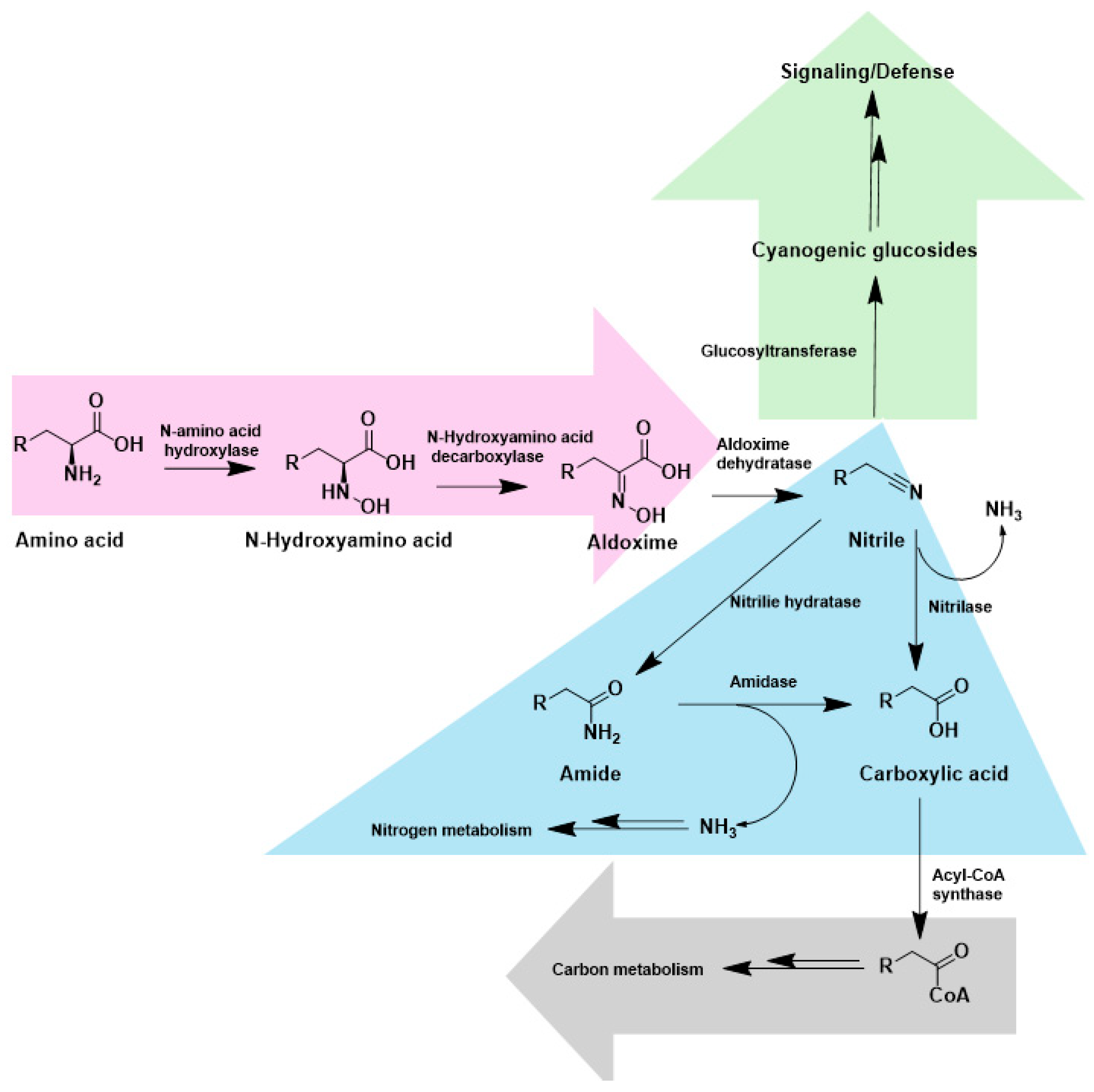 Figure 1. Aldoxime–nitrile pathway in microbes and plants, and the downstream metabolism of nitriles. Nitrilase directly hydrolyses nitriles produced in this pathway to carboxylic acids and ammonia. NHase catalyses the hydration of nitriles to amides, which are subsequently converted to carboxylic acids and ammonia by an amidase enzyme.
