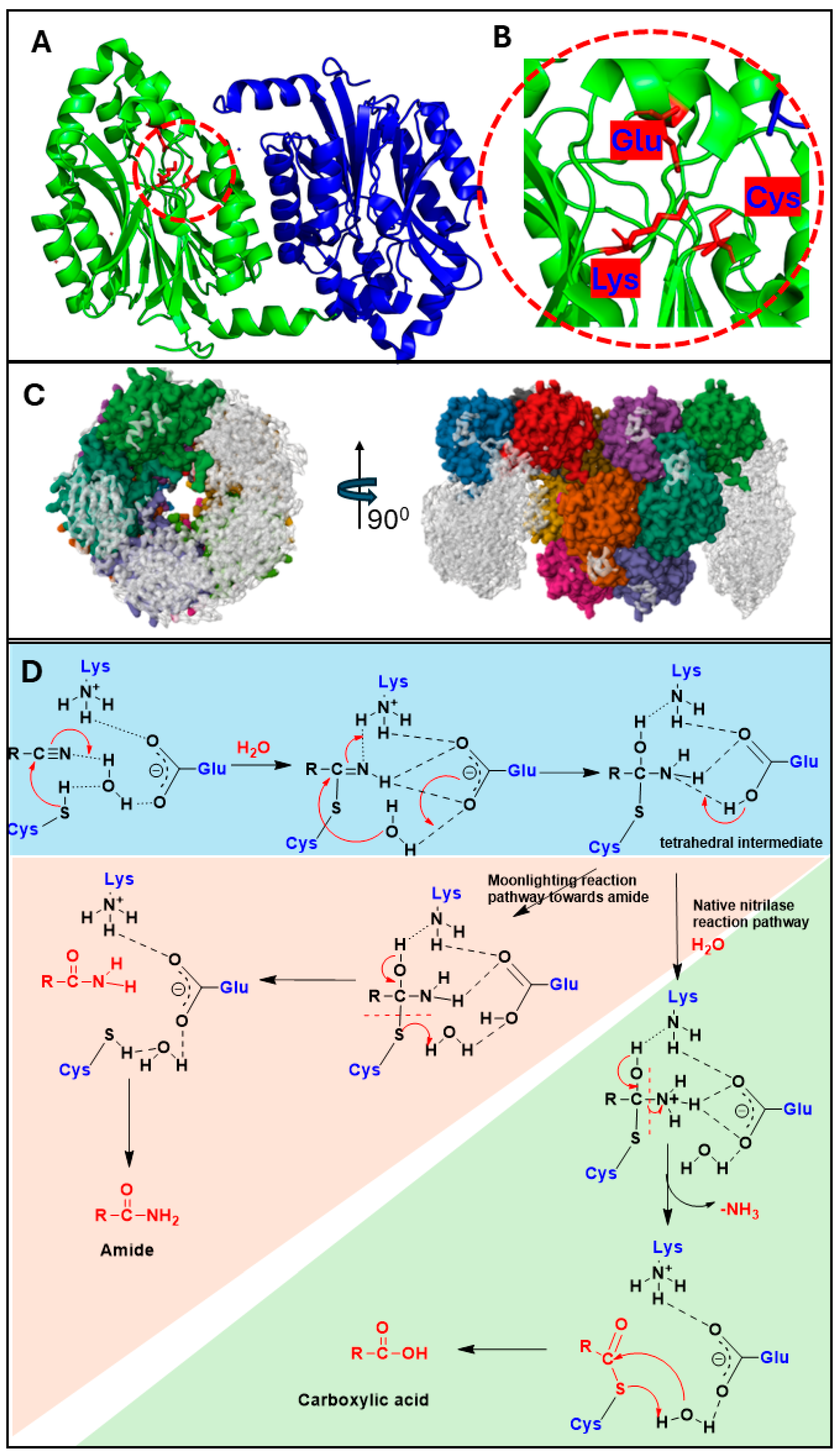 Figure 2. (A) The crystal structure of nitrilase from Synechocystis sp. PCC6803 (Pdb 3WUY). The catalytic triad (Glu-Lys-Cys) in the active site is shown as red sticks. Individual monomers are represented in green and blue cartoons. (B) The active site and catalytic triad. (C) Cryo-EM structure of an active helical nitrilase, the engineered nitrilase 4 from Arabidopsis thaliana (EMD-0320), showing higher order helical twist complex. (D) The proposed reaction mechanisms for the nitrilase-catalysed reaction. The native reaction pathway to the formation of carboxylic acid and the mechanism for moonlighting reaction that forms amide products are also shown.
