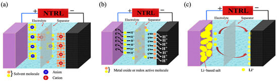 Schematic illustration of different types of supercapacitors: (a) electric double-layer capacitor (EDLC), (b) pseudocapacitor, and (c) hybrid supercapacitor (HSCs) [35]. Copyright 2022, American Chemical Society.