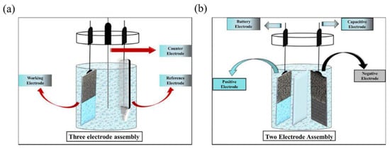(a) Three-electrode assembly used for testing different electrode materials [35]; (b) two-electrode assembly used to investigate real device measurements [35]. Copyright 2021, Elsevier Ltd. (Kidlington, UK).