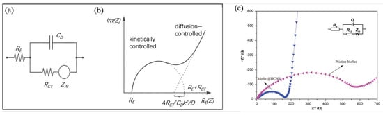 (a) Equivalent circuit diagram [48]. (b) Nyquist plots [48]. Copyright 2008, John Wiley & Sons, Inc. (Hoboken, NJ, USA) (c) Nyquist plots and their equivalent circuit diagrams of MoSe2@HCNS and pristine MoSe2 [46]. Copyright 2018, WILEY-VCH Verlag GmbH & Co., KGaA, Weinheim.