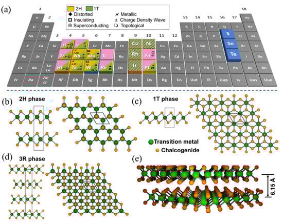 (a) The periodic table shows transition metal and chalcogenide combinations that can form layered TMDs. (b–d) The structure of different TMD polymorphs: (b) 2H phase, (c) 1T phase, and (d) 3R phase. (e) A 3D view of the 2H MoS2 bilayer showing an interlayer distance of 6.15 Å [54]. Copyright 2024, American Chemical Society.