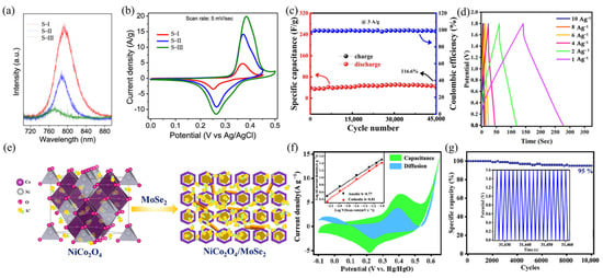 (a) PL spectra of MoSe2 (S−I), 1.5% Mn-doped MoSe2 (S−II), and 6.2% Mn-doped MoSe2 (S−III) [112]; (b) CV curves (at 5 mV/s) of pristine MoSe2 (S−I), 1.5% Mn-doped MoSe2 (S−II), and 6.2% Mn-doped MoSe2 (S−III) [112]. Copyright 2023, American Chemical Society. (c) Cycling performance of the NNM//AC device [23]. Copyright 2024, Elsevier B.V. (d) GCD curves at different scan rates and current densities at 0–1.8 V [111]. Copyright 2025, American Chemical Society. (e) Schematic diagram for the transformation of diffused-controlled to surface-controlled processes in the NiCo2O4/MoSe2 electrode [113]; (f) CV curves of NiCo2O4/MoSe2 electrodes [113]; (g) cycling stability of the electrode at 30 A g−1 for 10,000 GCD cycles (inset highlights the final cycles) [113]. Copyright 2022, American Chemical Society.