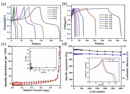 (a) GCD curves of the WSe2 electrode under different current densities [114]. Copyright 2022, Elsevier B.V. (b) GCD profiles of WSe2@rGO//AC-based ASC device under different current densities [115]. Copyright 2023, Elsevier B.V. (c) BET isotherm of M3 with inset showing pore size distribution [116]; (d) cycling stability and coulombic efficiency of M3 electrode over 3000 cycles at 6 A g−1 (inset: GCD curves before and after cycling) [116]. Copyright 2025, Elsevier B.V.