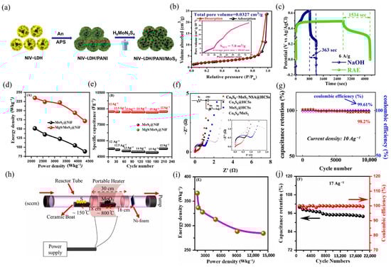Moreover, a broadened operating voltage of 1.72 V assembled with an ASC (MgS/MoS2@NiF//AC) demonstrated sustained 370 F g−1 at a high current density of 25 A g−1 and the optimal Ed of 288 Wh kg−1 at 3440 W kg−1. This device achieved 95% capacitance retention over 10,000 cycles under 20 A g−1. Liu et al. [118] fabricated a yolk–shell structure electrode based on Co9S8/MoS2 heterostructure nanosheet arrays (NSAs) on hollow carbon spheres (HCSs), combining the redox activity and conductivity of both components while enhancing ion diffusion via the porous shell. This unique core–shell structure (Co9S8-MoS2 NSAs@HCSs) enabled excellent cyclic stability, retaining 96.9% over 10,000 cycles under 10 A g−1. From the EIS profile, the composite showed a low Rct in both mid- and high-frequency regions, which indicated enhanced interfacial charge transfer (Figure 5f), a key indicator of catalytic activity in heterostructured electrodes. Simultaneously, it reflected a fast ion transfer in the low-frequency region. An ASC assembled with Co9S8-MoS2 NSAs@HCSs and HCSs (Co9S8-MoS2 NSA@HCSs//HCSs) demonstrated a superior electrochemical reversibility of 99.61% coulombic efficiency and 98.2% capacitance over 10,000 cycles (Figure 7g). Raza et al. [119] designed a silver-wrapped MoS2 structure on hierarchical nickel foam (Ni-F) using the CVD method, where the conductive Ag shell modulated the surface electronic properties and accelerated charge transfer. The composite displayed a cauliflower-like structure achieving an elevated SSA reaching 170 m2 g−1. Figure 7h illustrates the synthesis process of the Ag/MoS2/Ni-F electrode inside the reactor tube. The composite is stable and controllable by adjusting the temperature in different zones. The sizable SSA accommodates numerous active sites, showing an outstanding Sp.C of 4124 Fg−1 under 5 mVs−1. Moreover, the ASC device (Ag/MoS2/Ni-F//AC) exhibited an exceptional capacitance of 957 F g−1 at 1.8 A g−1. Furthermore, the device obtained a remarkable Ed of 366 Wh kg−1 at a Pd of 1494 W kg−1 (Figure 7i) and sustained 94% cyclic stability after 20,000 cycles at 17 Ag−1 (Figure 7j), which further highlights the role of doping in promoting reversible Faradaic reactions and long-term electrochemical stability.