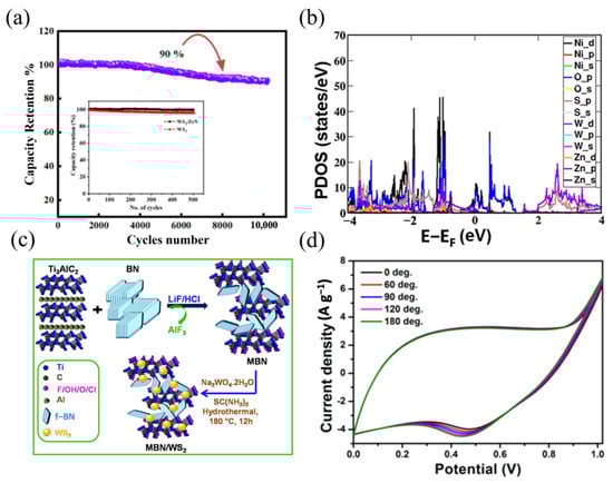 WS2 in the 2H phase presents semiconducting characteristics with a band gap of 1.9 eV [25], which leads to an intrinsic low electrical conductivity. In order to address this conductivity mismatch, Iqbal et al. [25] employed the sputtering technique to design a thin film structure, which was a uniform 100 nm layer of zirconium nitride (ZrN) and 250 nm WS2 on the surface of nickel foam. This interfacial structure enhanced the rate capability of charge diffusion and reduced the Rct to 2Ω, reflecting enhanced interfacial electron transport arising from the redox-active WS2/ZrN interface. The ASC device (WS2/ZrN//AC) presented a high Ed of 76 Wh kg−1 at a Pd of 4325 W kg−1. In addition, the capacitance retention maintained 90% over 10,000 cycles (Figure 8a). This study reconfirmed the charge storage mechanism by diffusive and capacitive cooperation: diffusion is obvious at a lower scan rate, while capacitive contribution is evident at a higher scan rate. The 2D layered structure of WS2 provides a support base for composites, facilitating the uniform dispersion of nanoparticles on its surface. Sharma et al. [120] investigated the composition of 0D ZnNi2O4 and 2D WS2 structures. Evidence suggested that 2D WS2 nanoflakes provide a robust support for uniformly anchoring ZnNi2O4 nanoparticles, effectively exposing more electroactive sites and facilitating interfacial redox reactions. The projection density of states (PDOS) profile revealed enhanced electronic states near the Fermi level, indicating the major metallic character of the ZnNi2O4/WS2 structure (Figure 8b) due to Ni-d and O-p orbital contributions, which benefits catalytic charge transfer efficiency. Moreover, the multi-orbital hybridization in the valence bands facilitated interfacial electron delocalization, promoting efficient charge transport characteristic of active heterointerfaces. The assembled ASC exhibited an exceptional capacitance of 171.3 F g−1 at 1 A g−1, along with an elevated Ed of 61.6 W h kg−1. In addition, the 2D layered structure of WS2 affords it exceptional flexibility. De et al. [28] fabricated an all-solid-state electrode for a flexible ASC device by integrating WS2-decorated Ti3C2Tx nanosheets with boron nitride (BN) via the hydrothermal method, forming an enlarged specific surface area with uniformly distributed redox-active sites (Figure 8c), which enhanced surface reactivity and charge storage. The assembled device (WS2/Ti3C2Tx/BN//Ti3C2Tx) displayed the capacitance of 140 F g−1 at 1 A g−1 in PVA/KOH/KI gel electrolyte. The inclusion of KI introduced reversible redox couples, which enhanced the electrolyte conductivity and promoted surface-mediated pseudocapacitive reactions. This device also showed excellent flexibility, with no evident change under the various bending conditions noted by GCD curves (Figure 8d). The flexible device exhibited long-term durability, retaining 84% capacitance after 10,000 cycles.