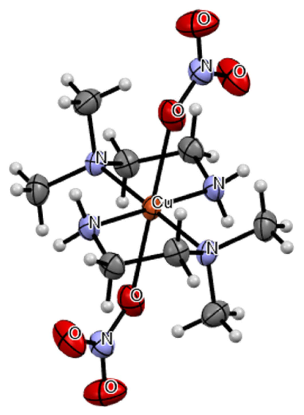 - Narayanan, B.; Bhadbhade, M.M. Non-Thermochromic Bis(N,N-dimethylethylenediamine)copper(II) Dinitrate. Acta Crystallogr. Sect. C Cryst. Struct. Commun. 1995, 51, 2016–2018. [Google Scholar] [CrossRef]