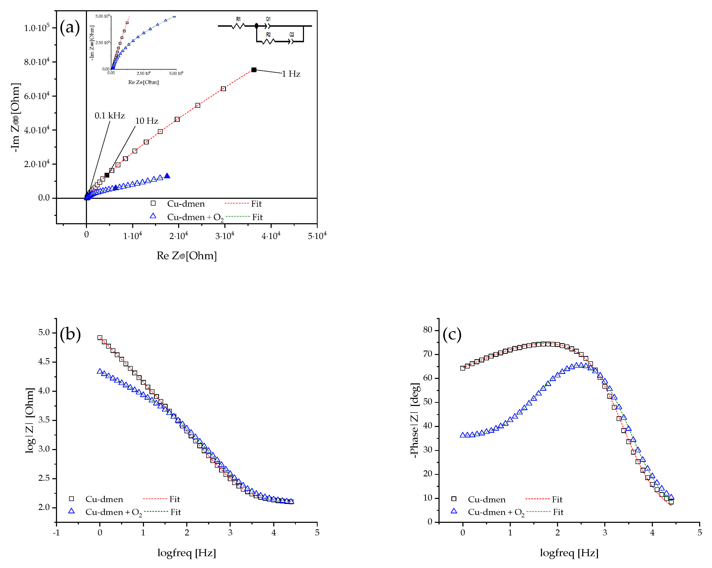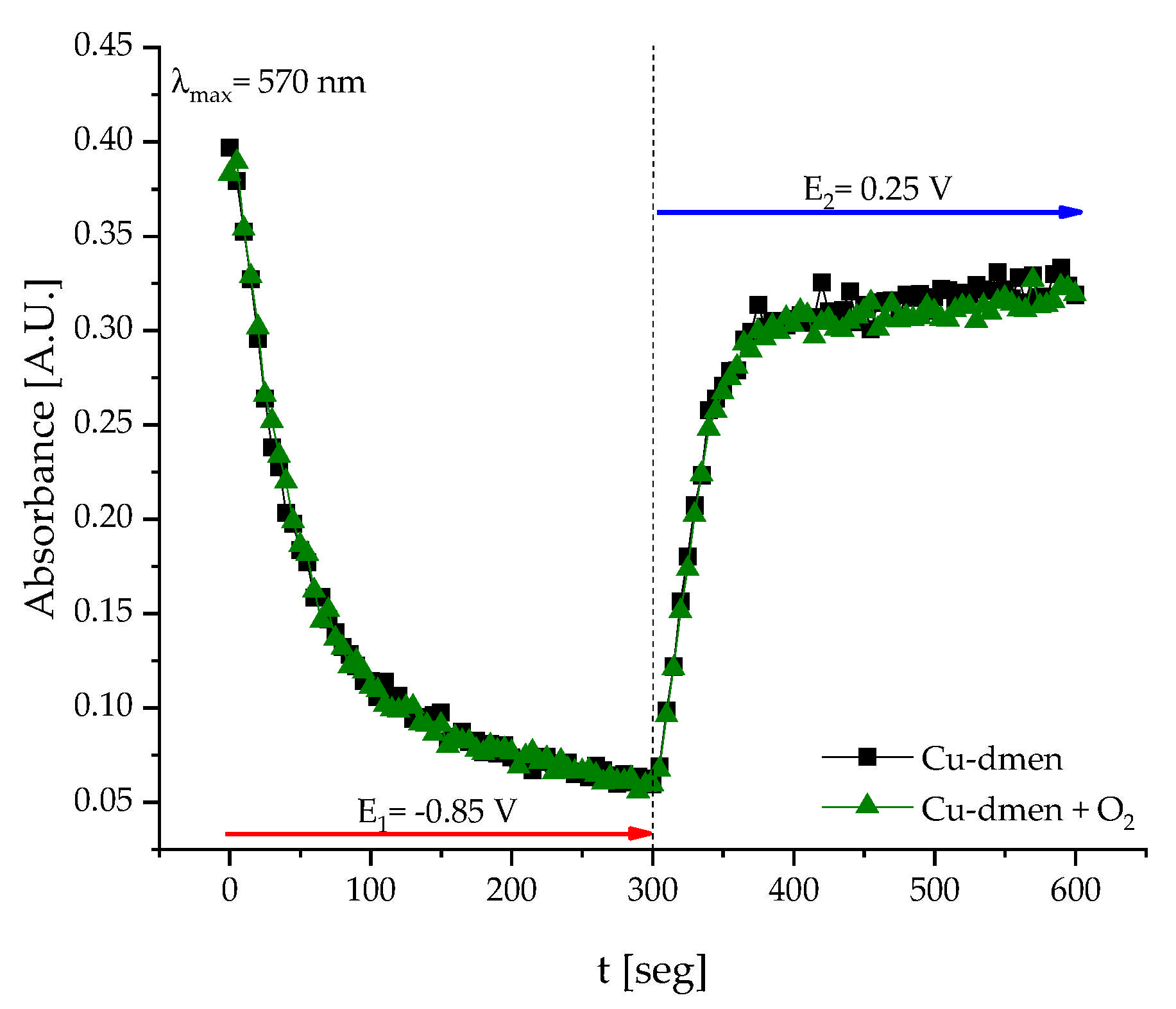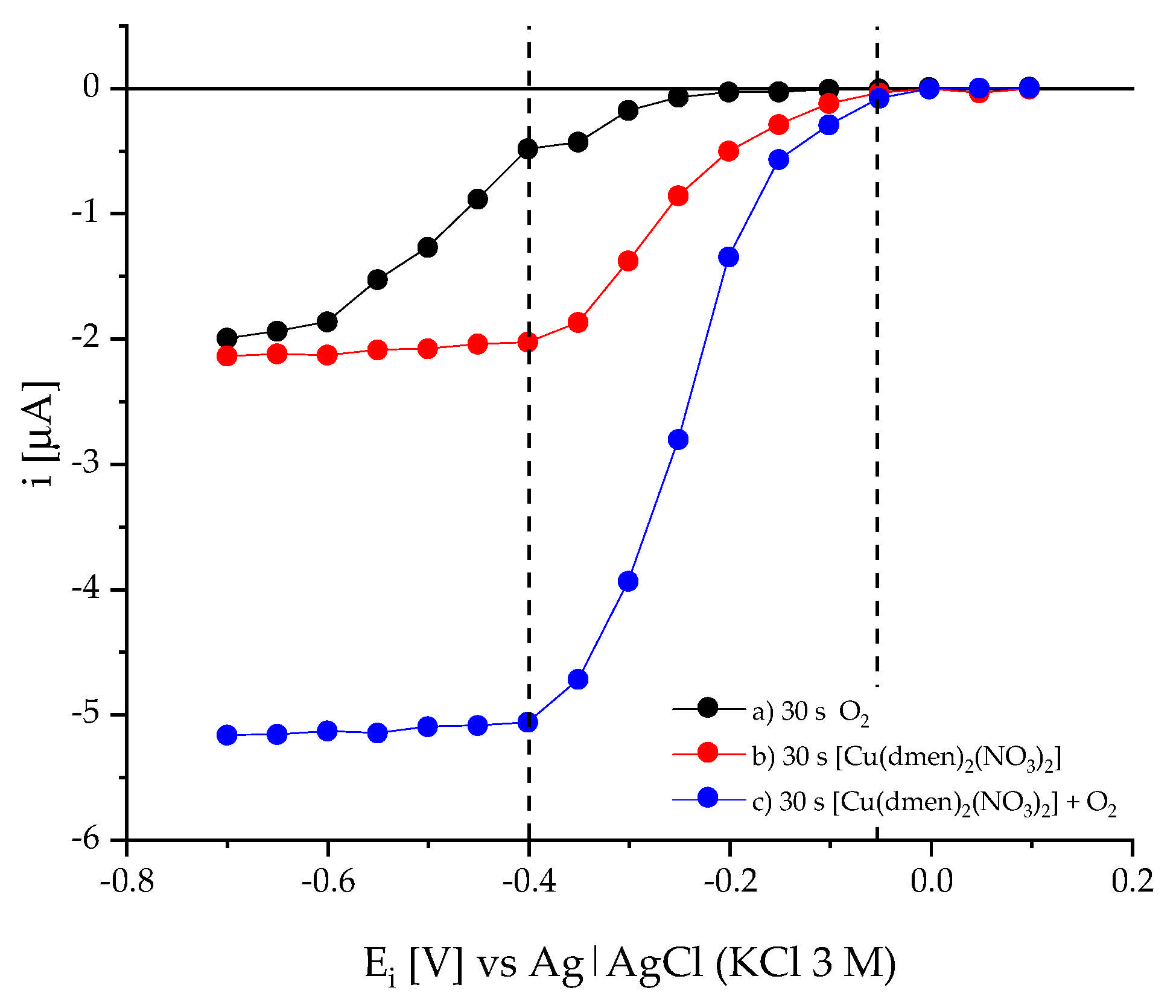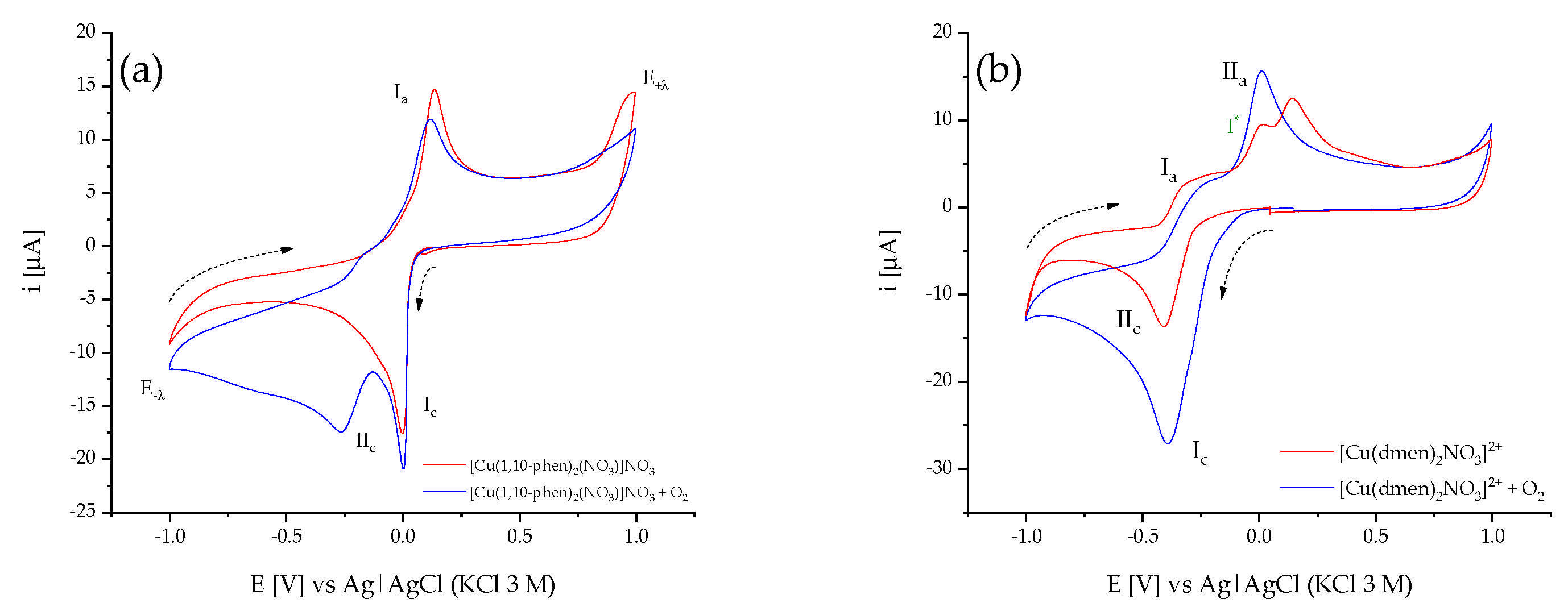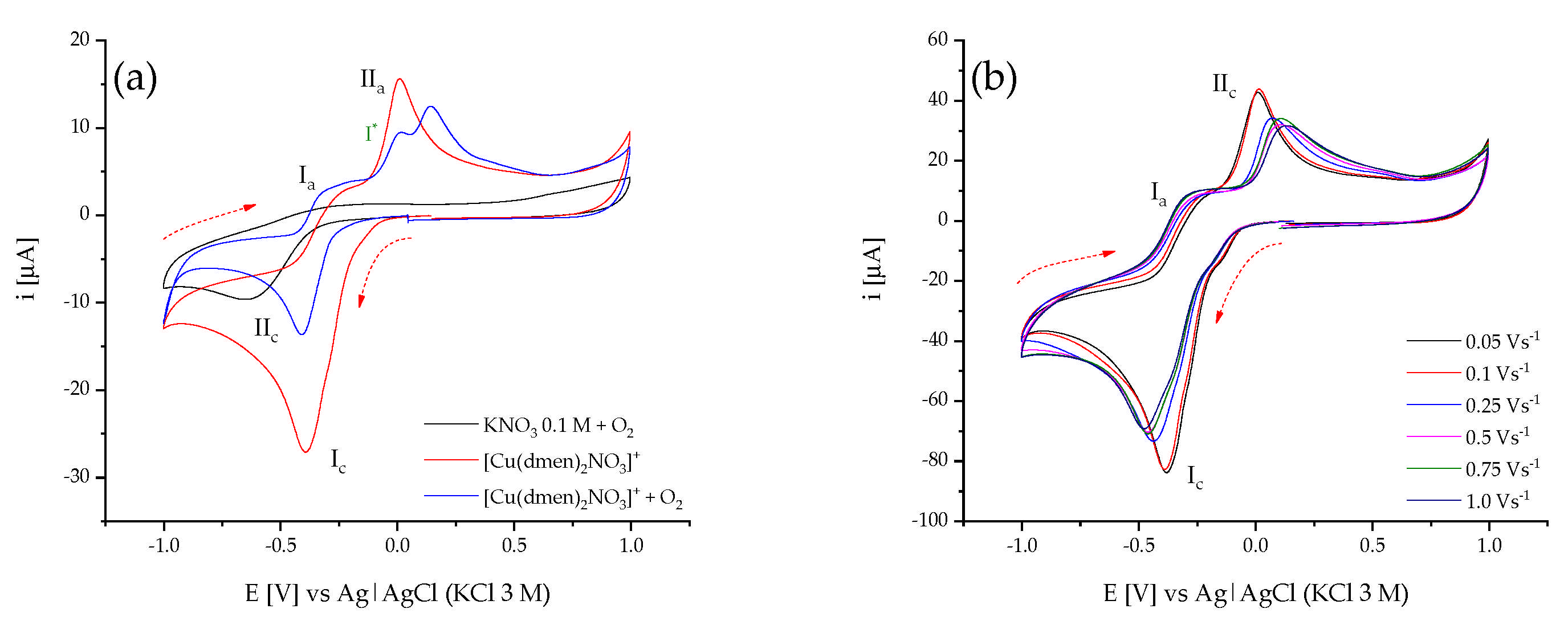 2.2. Electrochemical Behavior of Cu-dmen Complexes