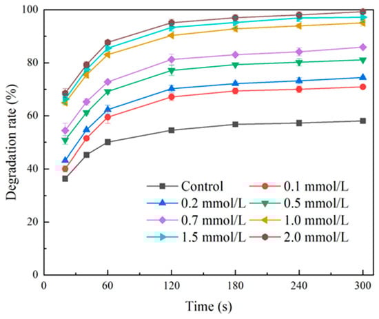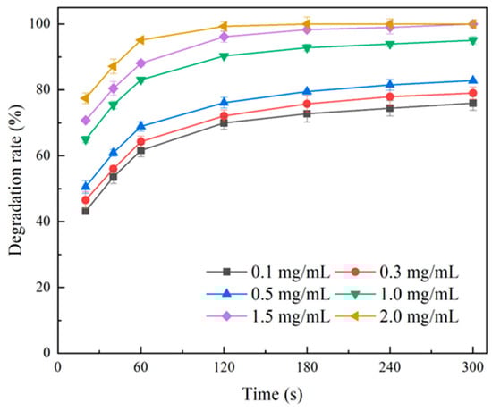 As shown in Figure 2, after a 5-min reaction at 25.0 °C and pH 6.0, the tetracycline degradation rates of the Lac–mediator system reached 95.07% and 100% at laccase concentrations of 1.0 mg/mL and 2.0 mg/mL, respectively. Considering both the degradation performance and economic cost, an optimal laccase dosage of 1.0 mg/mL is recommended.