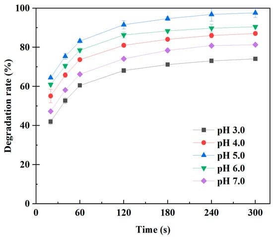 As shown in Figure 3, the degradation rate of tetracycline increased significantly within a pH range of 3.0 to 5.0. No notable change in the degradation efficiency was observed when the pH was raised from 5.0 to 6.0, whereas a significant decrease occurred at pH 7.0. Therefore, at 25 °C, the optimal pH range for this system was determined to be 5.0–6.0.