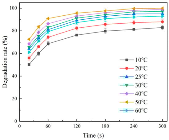 Effect of temperature on TC removal using Lac-GTP system (tetracycline concentration: 50 mg/L; GTP concentration: 1 mmol/L; laccase concentration: 1 mg/mL; pH: 6.0; reaction time: 0–300 s; temperature gradient: 10 °C, 25 °C, 37 °C, 50 °C, 60 °C).