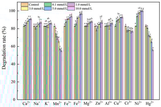 Effect of metal ions on TC removal using Lac-GTP system (tetracycline concentration: 50 mg/L; GTP concentration: 1 mmol/L; laccase concentration: 0.5 mg/mL; pH: 6.0; temperature: 25 °C; reaction time: 0–300 s; types of metal ions: Ca2+, Mg2+, Cu2+, Fe3+, Fe2+, Ni2+, Mn2+, Hg2+, Na+, K+, Zn2+; concentration range: 0.1–10.0 mmol/L; For each tested ionic group, different letters on the top of column indicate significant differences between means, p < 0.05).
