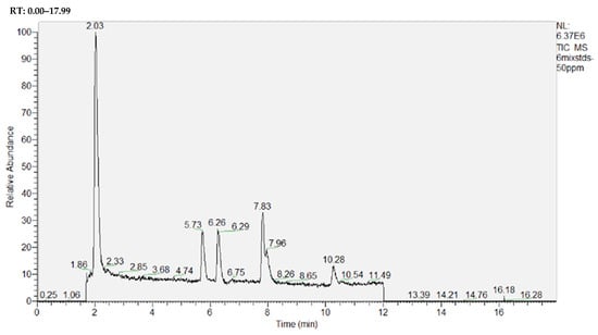 Figure 6 shows the high-performance liquid chromatography (HPLC) profile of a tea polyphenol sample. Owing to the complexity of its components, we selected representative bioactive constituents—gallic acid (GA), epicatechin (EC), epigallocatechin gallate (EGCG), epigallocatechin (EGC), and epicatechin gallate (ECG)—as standards to determine their relative abundances within the tea polyphenols. Figure 7 presents the mass spectra of the main polyphenol components in tea residues, where the identified chromatographic peaks correspond to GA, EC, EGCG, EGC, and ECG, respectively. In the tea polyphenol sample used in this experiment, gallocatechin (GC) and gallocatechin gallate (GCG) were not detected.