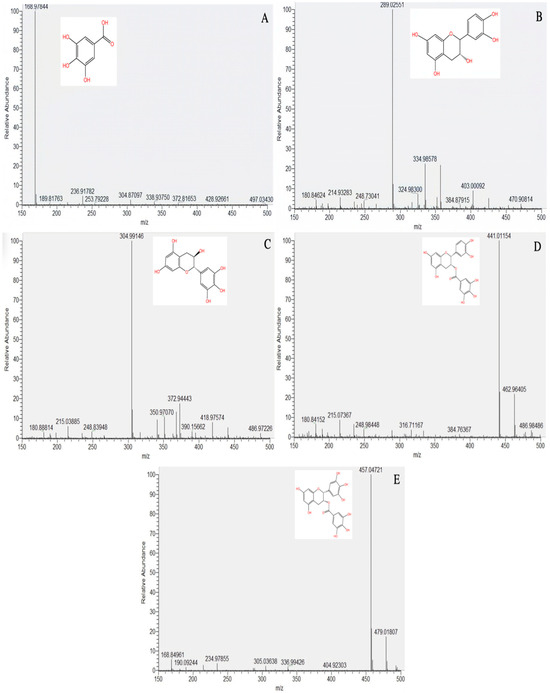 Mass spectra of main polyphenol components in tea leaves, obtained through LC-MS ((A): GA; (B): EC; (C): EGC; (D): ECG; (E): EGCG).