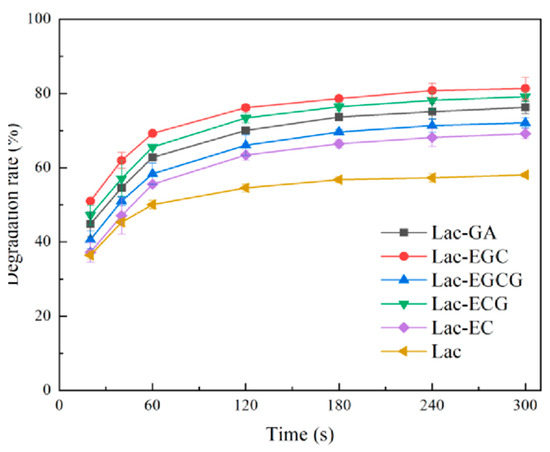 As shown in Figure 10 and Figure 11, the degradation products obtained after 5 min of treatment with either the Lac-GTP or Lac-ECG system no longer exhibited antibacterial activity. This loss of antimicrobial activity is likely attributable to the destruction of the tetracycline’s molecular structure and is consistent with the findings of Suda et al. [44], who reported a complete loss of antibacterial activity in tetracycline after 1 h of treatment with a Lac-HBT system at pH 4.5 and 30 °C under 150 r/min shaking [44].