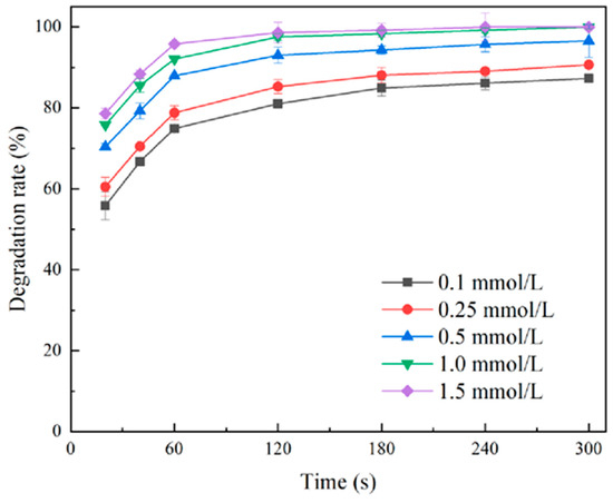 Effect of ECG concentration on TC degradation by Lac-ECG system (tetracycline concentration: 50 mg/L; laccase concentration: 1 mg/mL; pH: 6.0; temperature: 25 °C; reaction time: 0–300 s; ECG concentration gradient: 0.1, 0.25, 0.5, 1.0, 1.5 mmol/L).