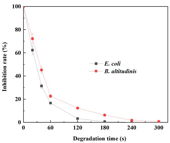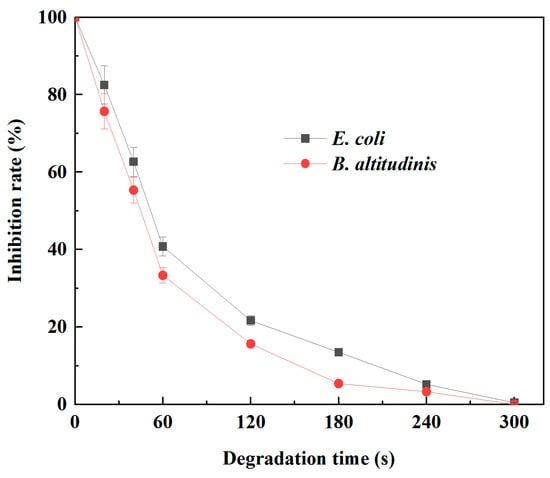 Antibacterial activity of TC degradation products obtained after treatment with Lac-ECG system (degradation system: tetracycline concentration 50 mg/L, ECG concentration 1 mmol/L, laccase concentration 1 mg/mL, pH 6.0, temperature 25 °C, reaction time 0–300 s).