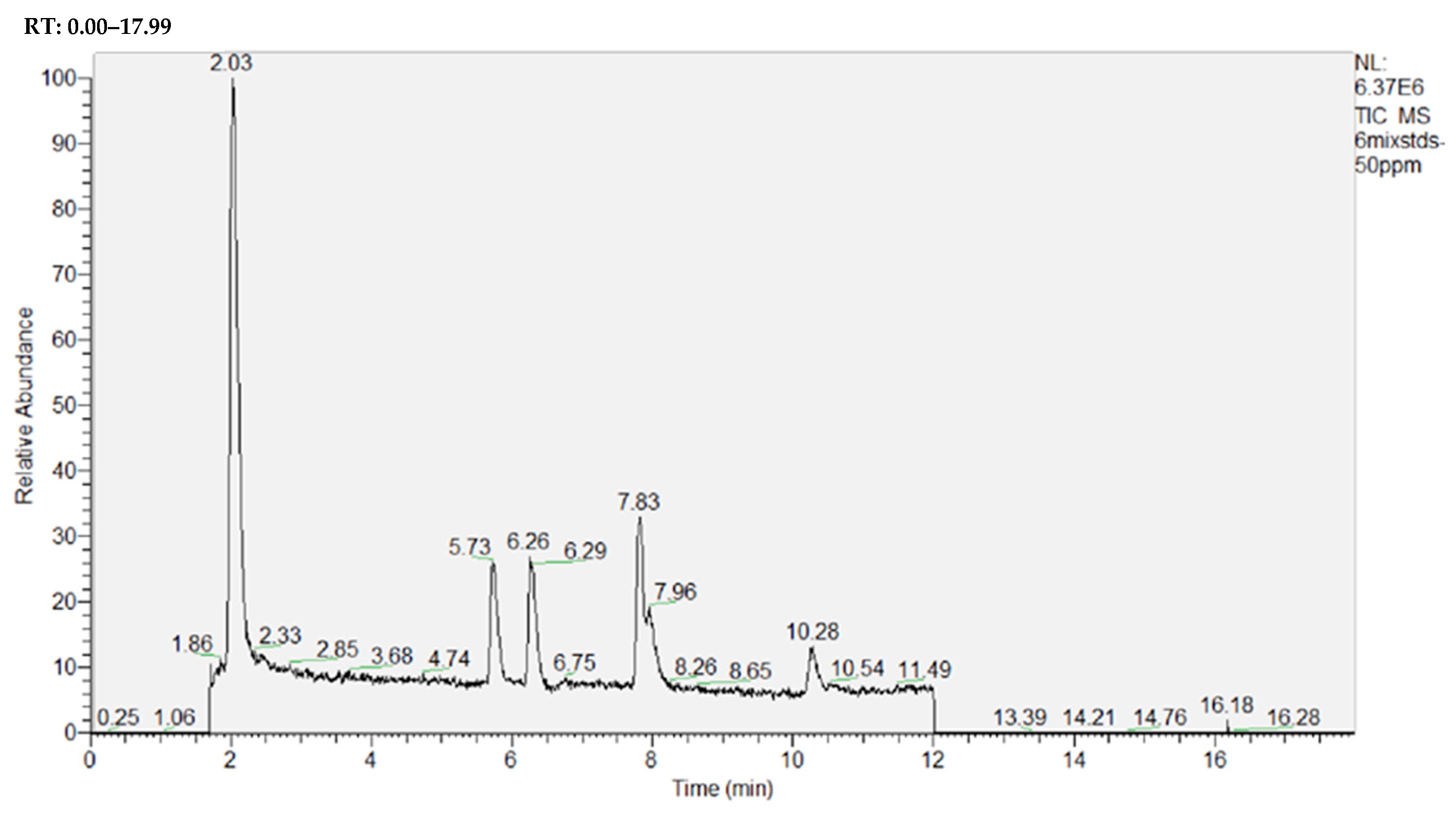| Content (mg/kg) | 117.40 ± 3.51 | 85.40 ± 2.61 | 9.20 ± 0.29 | 20.80 ± 0.63 | 7.20 ± 0.29 |