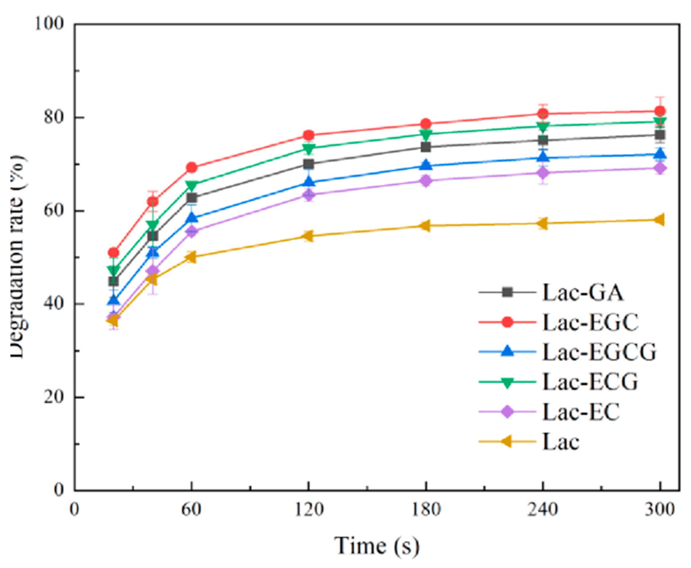 | Degradation rates of different laccase–mediator systems (%) | 76.25 ± 3.05 | 81.35 ± 3.22 | 70.10 ± 2.79 | 69.15 ± 2.97 | 79.15 ± 3.38 |