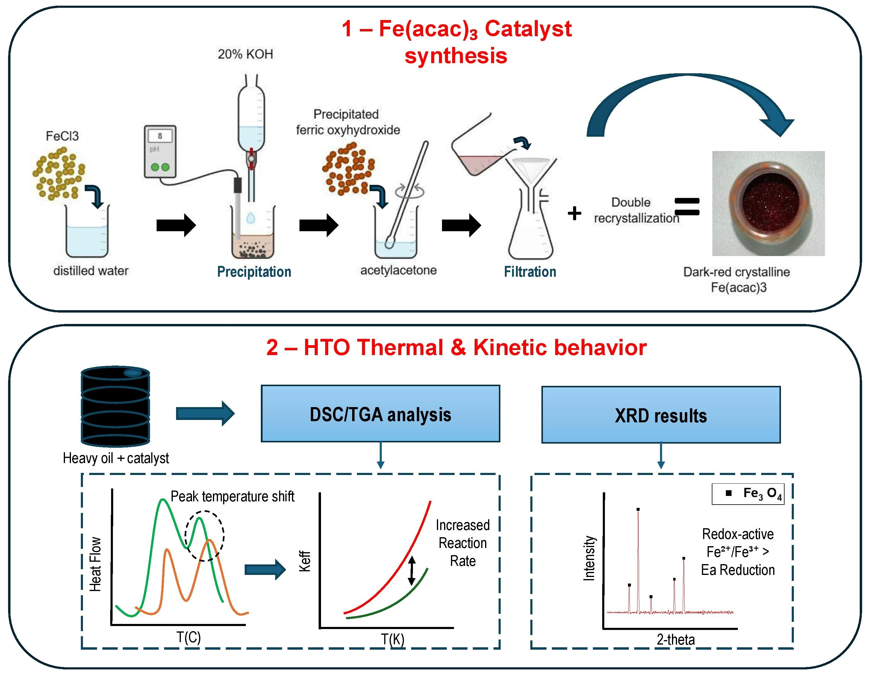 This research addresses the identified gap in HTO catalysis through three specific objectives. First, we aim to quantify the influence of Fe(acac)3 on the kinetic parameters (activation energy and pre-exponential factors) of both LTO and HTO regions during heavy oil oxidation. Second, we will characterize the structural and morphological evolution of iron species during thermal decomposition to identify the catalytically active phases responsible for enhanced oxidation. Third, we seek to establish mechanistic relationships between the iron oxide phases formed and their specific catalytic effects on oxidation pathways, with particular focus on HTO enhancement. By revealing how Fe(acac)3 transforms oxidation pathways and enhances combustion, we aim to advance more efficient, cost-effective, and environmentally friendly methods for heavy oil recovery through catalytically improved in situ combustion.