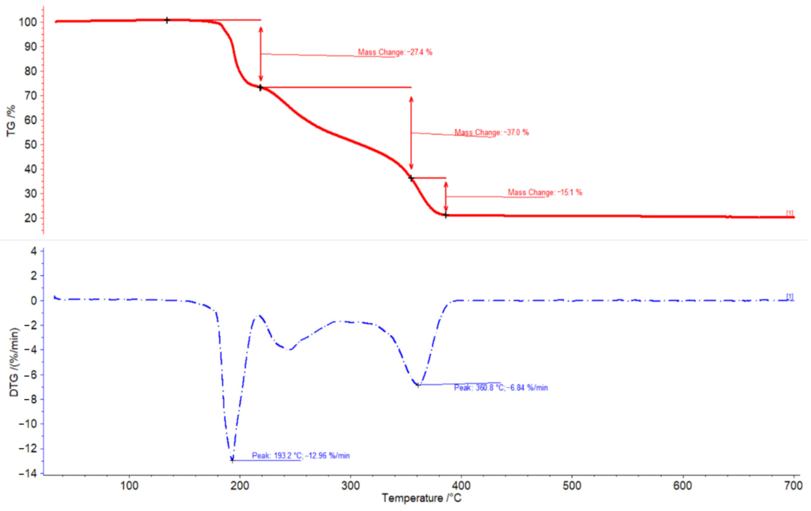 Figure 2). A 15.1% mass loss occurs between 330 and 380 °C, with a prominent DTG peak at 360 °C. This represents the final decomposition stage that determines subsequent catalytic activity. It corresponds to the decomposition of remaining organic ligands and formation of iron oxide species (XRPD analysis confirms this transformation). The previous mass losses (27.4% and 37.0%) observed at lower temperatures are associated with the initial removal of coordinated and non-coordinated acetylacetonate ligands.