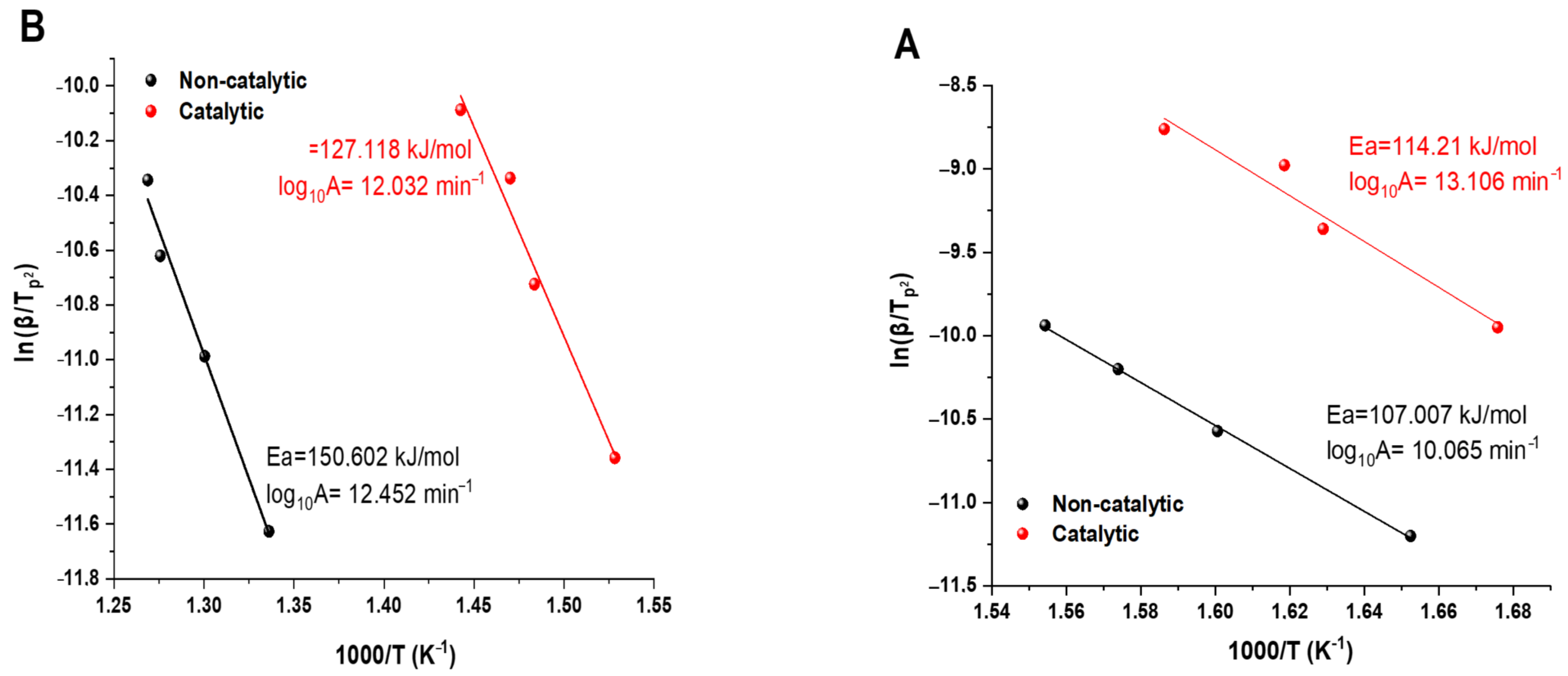 Figure 4B). The activation energy decreased substantially from 150.6 kJ/mol (non-catalytic) to 127.1 kJ/mol (catalytic), representing a 23.5 kJ/mol reduction. Concurrently, the pre-exponential factor slightly decreased from log