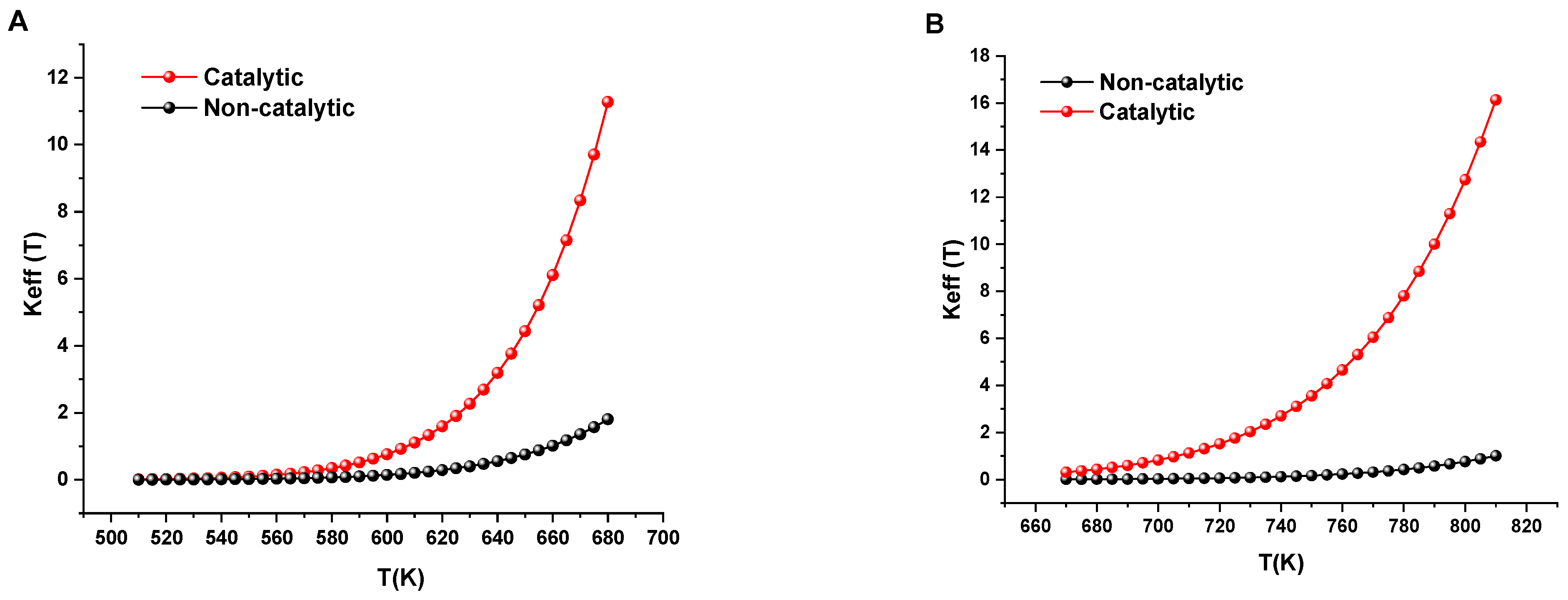 Figure 5B) demonstrates even more dramatic catalytic effects, with reaction rates 8–10 times greater than the non-catalytic system near 800 K. This exceptional enhancement correlates directly with our structural characterization showing complete formation of crystalline magnetite at 360 °C (~633 K). The rate constant curves begin to diverge dramatically precisely at temperatures where magnetite becomes the dominant iron phase, confirming our proposed structure-activity relationship. Most notably, at equivalent reaction rates (for example, Keff = 2), the catalytic system achieves comparable oxidation at temperatures approximately 60–70 K lower than the non-catalytic system, a significant energy saving for field applications.