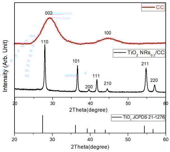 XRD pattern of CC and TiO2 NRs grown on CC.
