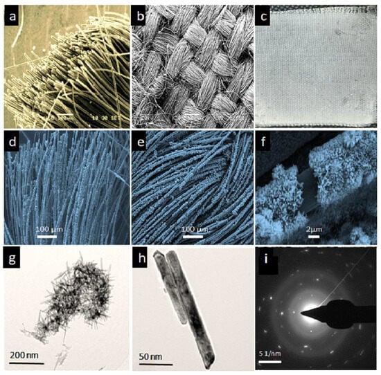 The morphological features of the pristine CC and TiO2 NRs grown on CC were examined by employing scanning electron microscopy (SEM) and transmission electron microscopy (TEM) analyses. Figure 2a,b shows the surface morphologies of pristine CC, where the individual carbon fibers have exhibited a smooth surface, and they have a tightly woven textile structure. The absence of surface deposits confirms that the acid pretreatment effectively removed impurities, leaving behind a clean substrate suitable for TiO2 nucleation. Upon hydrothermal growth, significant structural modifications were observed. The digital photograph in Figure 2c shows the overall whitish appearance of TiO2NR0.3/CC, indicating uniform deposition of TiO2 nanostructures. At lower SEM magnification (cf. Figure 2d), the carbon fibers are seen to be uniformly coated with vertically aligned TiO2 NRs, forming a dense nanorod network across the substrate. With higher magnification (i.e., Figure 2e,f), it becomes clear that the nanorods are radially anchored onto the carbon fiber surface, creating a roughened texture compared to pristine CC. The nanorods are densely packed with diameters in the tens of nanometers and lengths extending into the micrometer range. Such dense vertical alignment can be attributed to the TiCl4 seeding and chloride-assisted hydrothermal conditions, which promote anisotropic rutile TiO2 growth through selective facet stabilization [20,22]. The TEM micrographs provide further insights into the structural features. Figure 2g shows a cluster of elongated TiO2 NRs with uniform size distribution, while the high-resolution TEM image in Figure 2h displays individual nanorods with clear lattice fringes, confirming their single-crystalline nature. The SAED pattern in Figure 2i exhibits sharp diffraction spots characteristic of a well-ordered rutile crystal structure, in agreement with the XRD analysis. The formation of single-crystalline rutile nanorods directly on a conductive and flexible CC substrate ensures strong interfacial adhesion, enhanced electron transport, and high surface area, all of which are highly desirable for the practical applications of photocatalysis.