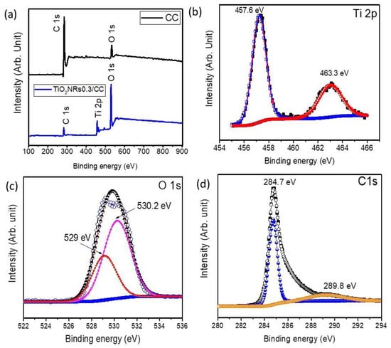 (a) Full survey XPS spectra of CC and TiO2NRs0.3/CC, (b–d) high-resolution spectra of Ti 2p, O 1s, and C1s.