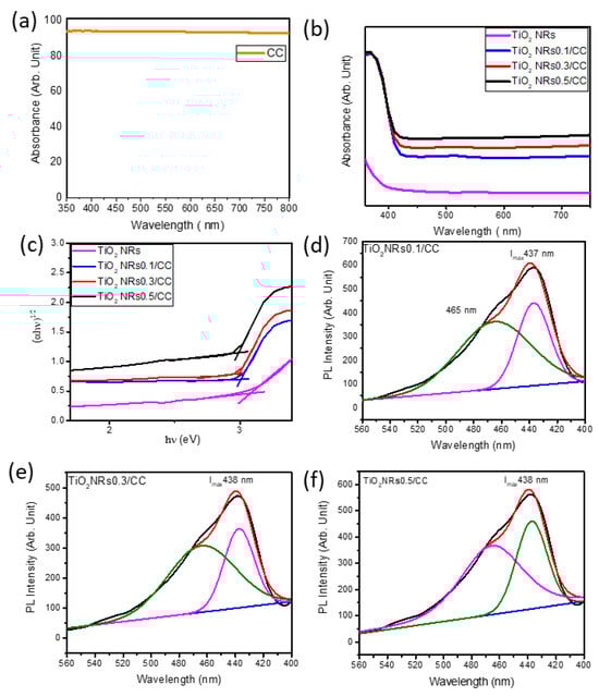 The optical and photophysical properties of TiO2NRs/CC were systematically examined through UV–Vis absorbance (Figure 4a,b), Tauc band gap analysis (Figure 4c), and photoluminescence spectroscopy (Figure 4d–f). Figure 5a shows the diffuse reflectance UV–Vis spectra, revealing broadened absorption extending from the UV into the visible region, particularly for samples seeded with higher TiCl4 concentrations. This red shift and enhanced visible-light absorption align with previous findings that carbonaceous supports effectively extend TiO2’s light-harvesting capabilities through improved interfacial interactions and charge transfer dynamics. In Figure 4c, pristine TiO2 NRs exhibited a band gap of 3.08 eV, corresponding to an absorption edge near 403 nm. When integrated with carbon cloth, a slight reduction in the band gap was observed, with values of 3.01 eV, 2.99 eV, and 2.99 eV for TiO2 NRs grown using 0.1 M, 0.3 M, and 0.5 M TiCl4, respectively. This red shift of about 0.07–0.09 eV indicates improved light absorption due to the interaction between TiO2 and the conductive carbon substrate. The shift is likely attributed to interfacial states, defect levels, or C–Ti–O bonding, which extend the absorption edge marginally into the near-UV–visible region. Importantly, increasing the TiCl4 concentration from 0.3 M to 0.5 M did not significantly alter the band gap, suggesting that the optical modification saturates around 0.3 M. This implies that further increases in the precursor concentration primarily influence the nanorod density and morphology rather than the electronic structure. From a practical perspective, 0.3 M TiCl4 offers an optimal balance, as it achieves the desired band gap narrowing while minimizing excess precursor use. This trend is consistent with the literature reports where carbon doping or carbon support leads to band gap narrowing in TiO2 composites [26]. The photoluminescence (PL) spectra of TiO2 NRs deposited on CC are deconvoluted, as shown in Figure 4d–f. Two characteristic emission bands are observed for all samples, with the first peak appearing at 437 nm for TiO2NRs0.1/CC and ~438 nm for TiO2NRs0.3/CC and TiO2NRs0.5/CC, corresponding to near band-edge excitonic recombination. The second peak occurs around 465–466 nm and is attributed to intrinsic defect states, mainly oxygen vacancies and Ti3+ centers. The maximum PL intensities were found to be 592 a.u. for TiO2NRs0.1/CC, 462 a.u. TiO2NRs0.3/CC, and 559 a.u. for TiO2NRs0.5/CC. Especially, TiO2NRs0.3/CC shows the strongest quenching effect. This reduction in PL intensity demonstrates improved charge separation and longer carrier lifetimes due to the conductive CC acting as an electron sink. Such enhanced charge dynamics are essential for maximizing H2 generation efficiency and ensuring effective degradation of organic pollutants. Interestingly, at the 0.5 M concentration, the loading in PL intensity is slightly increased. This seems to be attributed to excess CC hindering light absorption or introducing recombination centers [27].