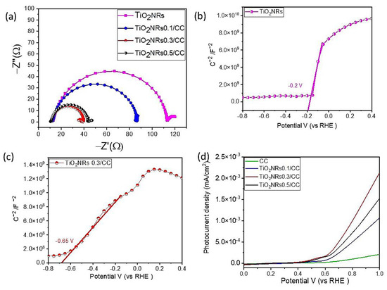 (a) EIS spectra, (b,c) Mott–Schottky plots of TiO2 NRs and TiO2NRs0.3M/CC, (d) linear sweep voltammetry measurement of electros.