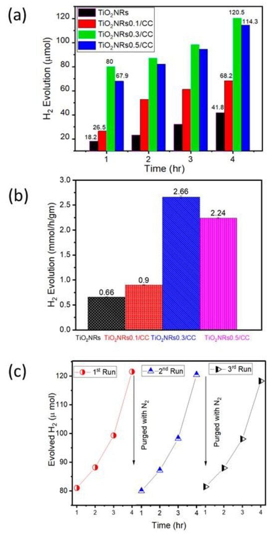 Through this synergistic charge separation mechanism, the H2 generation efficiency is maximized, and TiO2NR0.3/CC achieves the highest rate (2.66 mmol h−1 g−1).