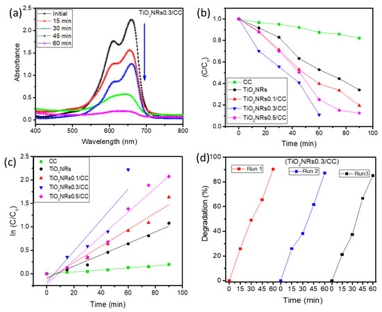 (a) Time-dependent absorption spectra of MB dye using TiO2NRs0.3/CC, (b) photocatalytic degradation curve of as-prepared photocatalysts, (c) kinetics of MB dye degradation, (d) recycling stability of TiO2NRs0.3/CC photocatalyst.