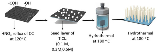 The TiO2 NRs were grown on CC by a hydrothermal method. Initially, the CC was refluxed in concentrated HNO3 acid at 120 °C for 4 h, during which the strong oxidizing conditions removed surface impurities and introduced oxygen-containing groups such as –COOH and –OH. These functional groups increased the hydrophilicity of the surface and provided active nucleation sites for TiO2 growth [39]. The cleaned and dried carbon fabric was then immersed overnight in ethanol solutions containing TiCl4 with concentrations of 0.1 M, 0.3 M, and 0.5 M. In ethanol, TiCl4 was partially hydrolyzed to form amorphous Ti–O–Ti species, which uniformly coated the fiber and acted as seed layers [40]. The seeded fabric was annealed in a muffle furnace at 400 °C for 30 min, transforming the amorphous titanium species into crystalline TiO2 nanocrystallites and improving adhesion to the carbon surface. In the next step, 4 mM of TBT, Ti(OC4H9)4 was dissolved in a mixed solvent of 20 mL hydrochloric acid and 20 mL acetone, and stirred to obtain a clear solution. Here, acetone served as a cosolvent to slow down uncontrolled hydrolysis, while HCl provided both water and chloride ions: water molecules initiated the controlled hydrolysis of TBT, and Cl− ions selectively adsorbed onto crystal facets to promote anisotropic growth [22]. This precursor solution and the seed-coated carbon fabric were transferred to a Teflon-lined autoclave and heated at 180 °C for 6 h. These conditions are consistent with the literature reports showing that rutile TiO2 nanorods form preferentially in chloride-assisted acidic media under such conditions [41,42]. Under these circumstances, dissolved titanium species nucleated and preferentially grew into rod-like TiO2 structures on the seeded surface, guided by the high acidity and chloride concentrations [43]. After slow cooling to room temperature, the white TiO2 NRs were rinsed with DI water and ethanol to remove residual ions and organics, and then dried at 70 °C for 10 h to obtain a clean, uniform NRs array on the carbon fabric. The TiO2 NRs grown on carbon fabric were designated according to the concentration of the TiCl4 seed solution used during the seeding step. When 0.1 M TiCl4 was employed, the sample was denoted as TiONR0.1/CC, while those prepared with 0.3 M and 0.5 M TiCl4 seed solutions were labeled as TiONR0.3/CC and TiONR0.5/CC, respectively. This convention directly reflects the influence of the seeding concentration on the density and uniformity of TiO2 NR growth on the CC substrate. The CC was weighed before and after the deposition of TiO2 NRs. The bare CC was weighed before the growth of TiO2 NRs. After hydrothermal deposition and subsequent treatment, the TiO2 NRs NRs-decorated CC was dried and weighed again to determine the loading amount of TiO2. Pristine TiO2 NRs were synthesized without a CC substrate. The schematic illustration of the synthesis of TiO2 NRs on CC is presented in Figure 8, with the key reactions outlined below.