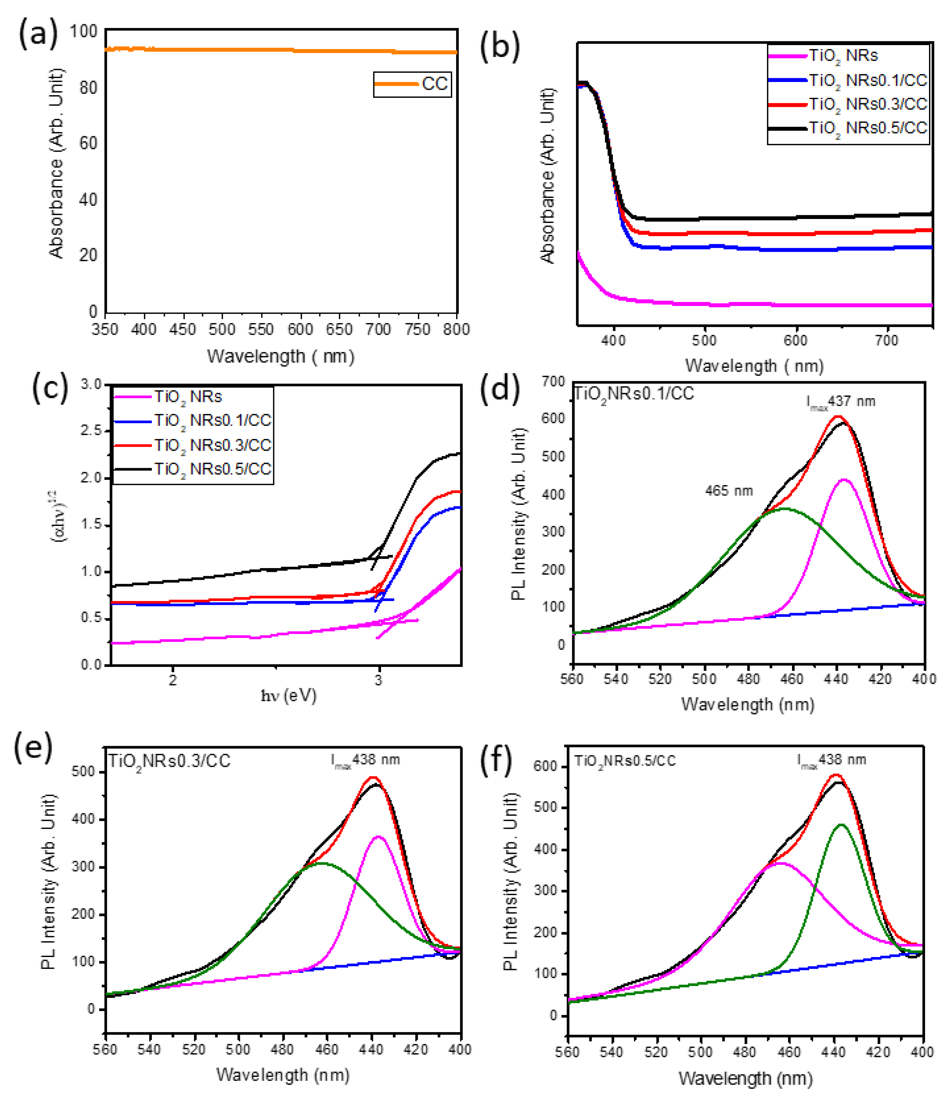 2.4. Optical and Photophysical Properties of TiO2 NRs/CC