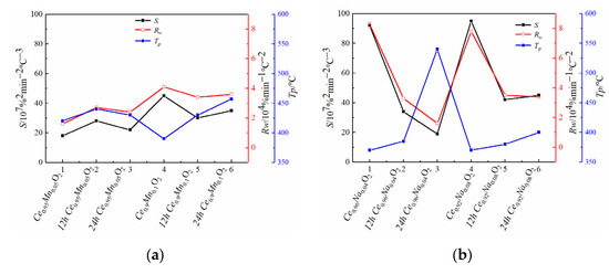 In order to investigate the effects of different metal-modified ceria catalysts on the oxidation characteristics of PM, S, Rw, and Tp of the mixtures of PU with four metal-modified ceria catalysts are compared in Figure 2. It is shown that the introduction of ceria catalysts promotes the oxidative reaction of PM, which is manifested by the enhancement of S and Rw as well as the decrease in Tp. Under the condition of the same PU/catalyst mixing ratio, the S and Rw of different metal-modified ceria-based catalysts exhibited the same trend, showing a decreasing order: Na> Pt >Mn> Zr. In contrast, the Tp showed the following decreasing order: Zr > Mn > Na > Pt.
