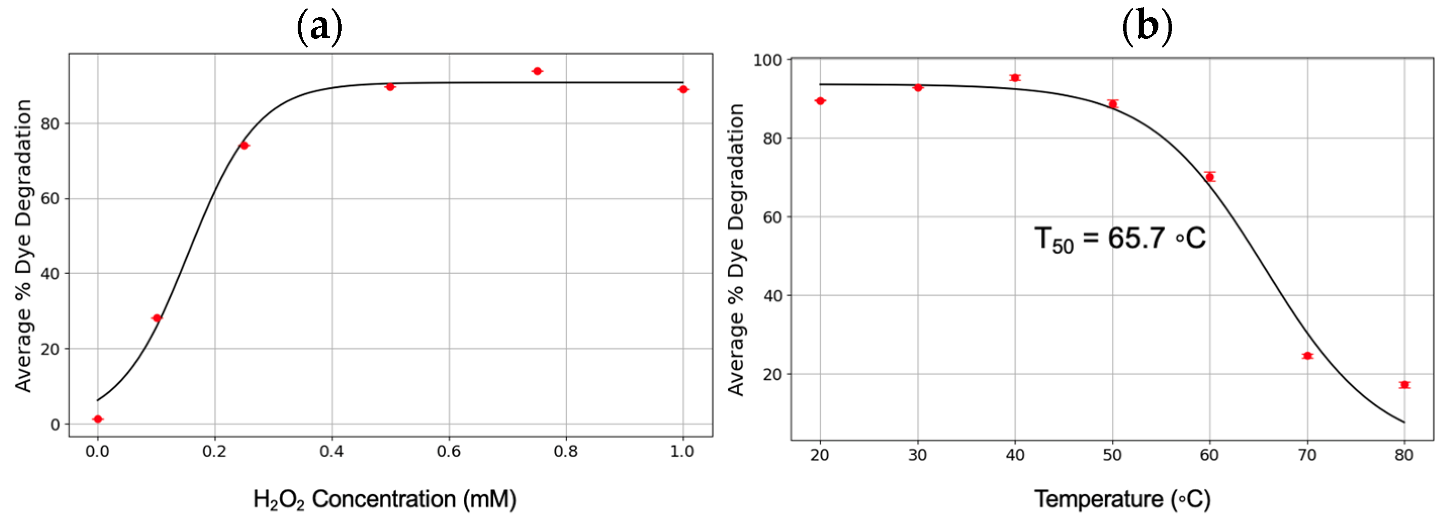 - Zhang, J.; Feng, M.; Jiang, Y.; Hu, M.; Li, S.; Zhai, Q. Efficient Decolorization/Degradation of Aqueous Azo Dyes Using Buffered H2O2 Oxidation Catalyzed by a Dosage below Ppm Level of Chloroperoxidase. Chem. Eng. J. 2012, 191, 236–242. [Google Scholar] [CrossRef]