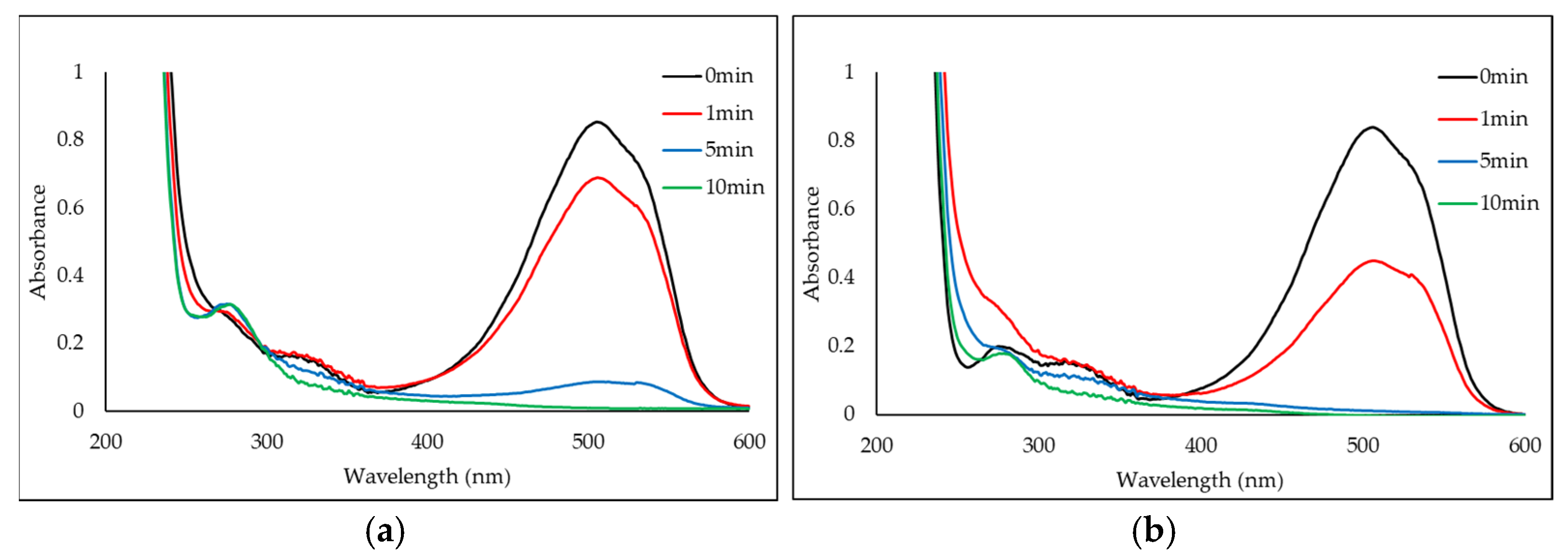 2.1. Optimizing Reaction Conditions for MO and OG Degradation