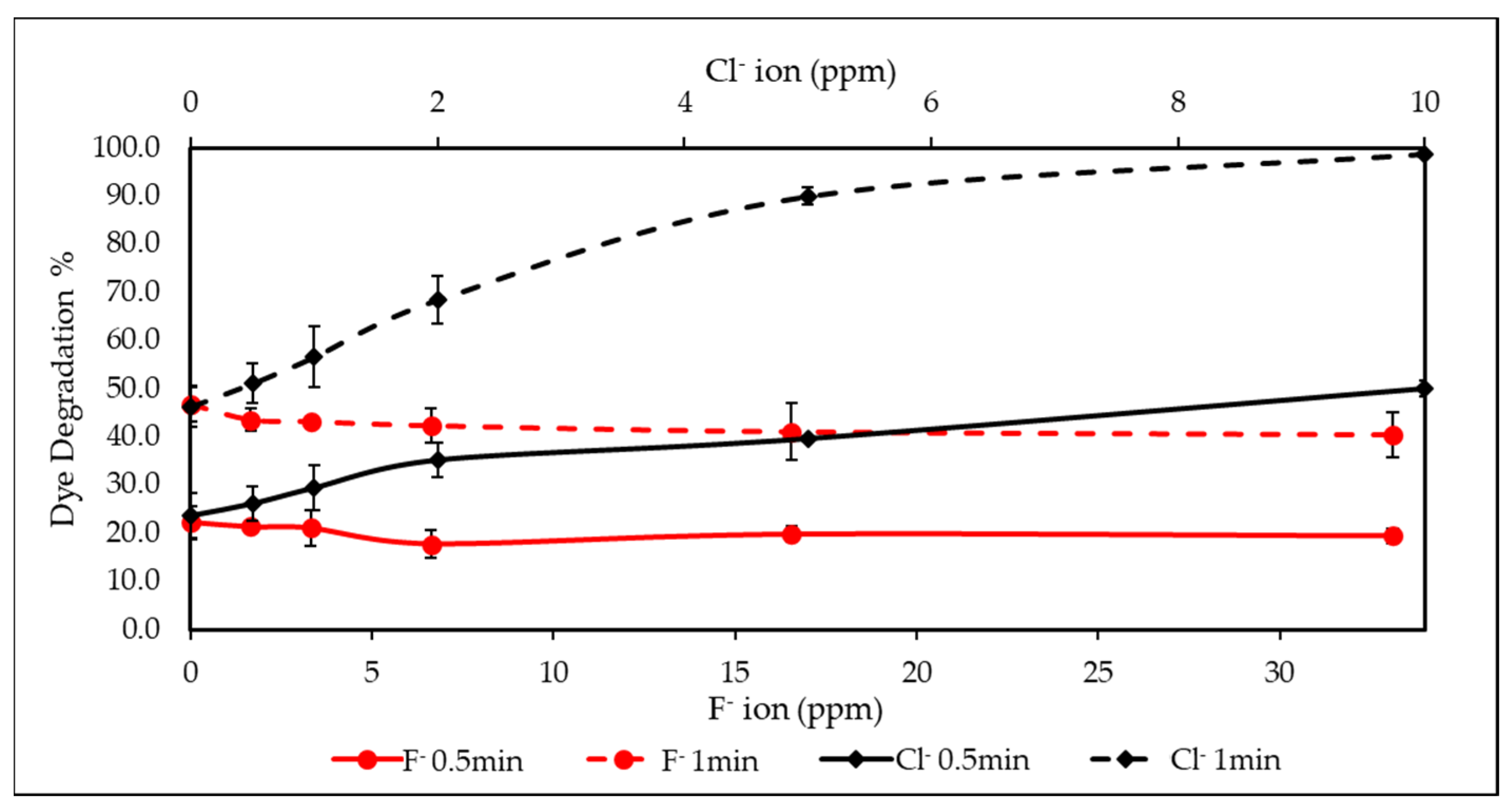 2.2.1. Degradation Efficiency with Chloride and Fluoride Ions