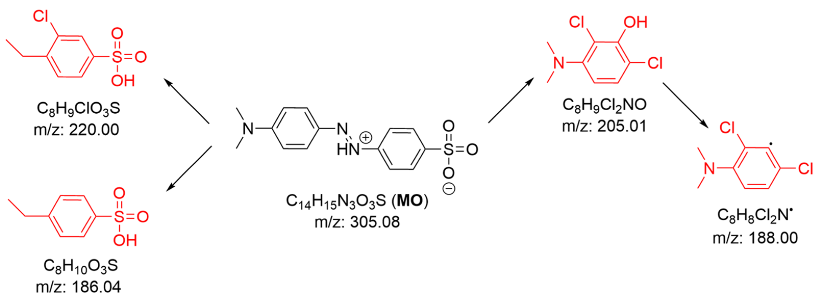 2.2.2. Degradation Products of Azo Dyes by CPO with and Without Chloride Ions by LC/MS
