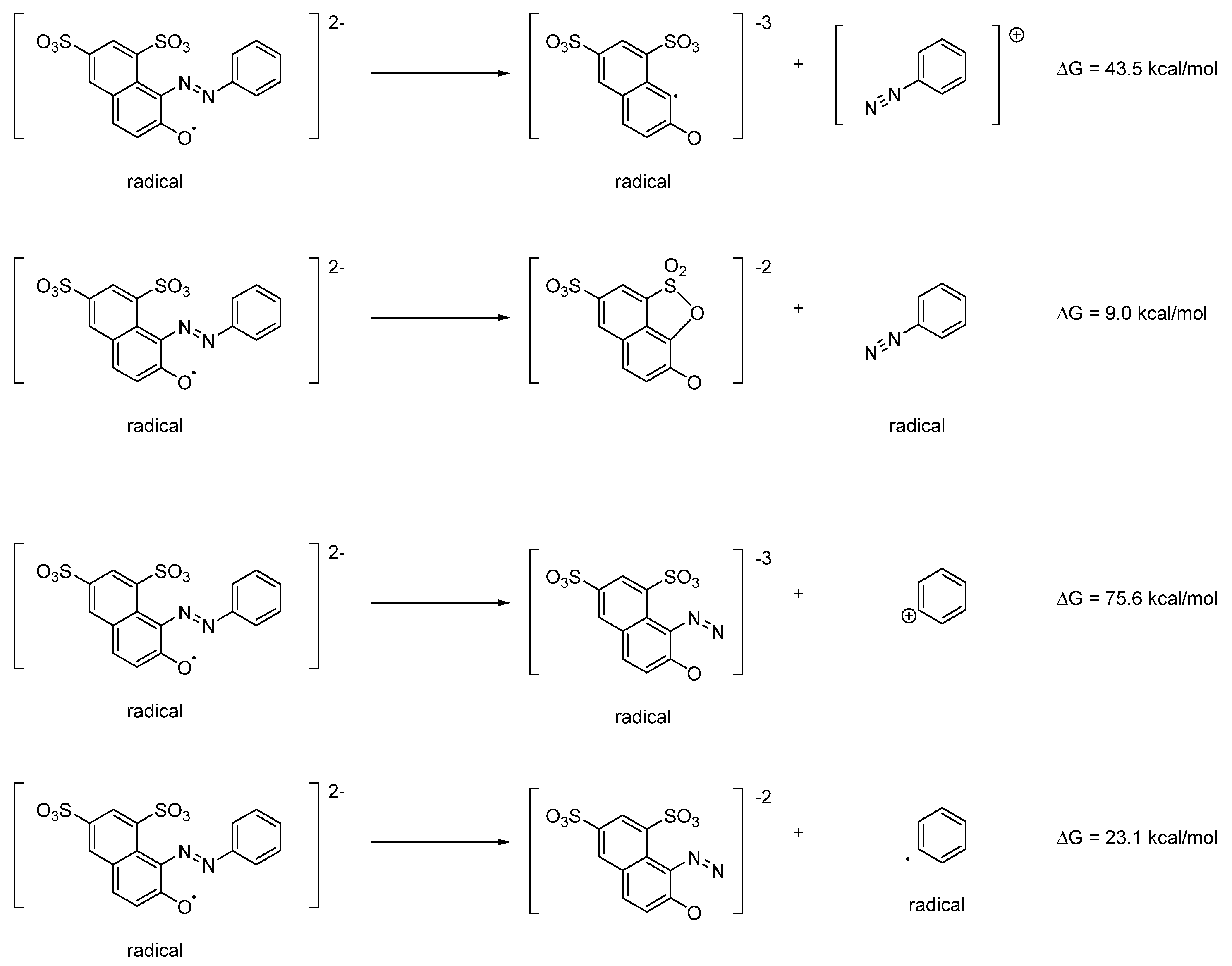 2.2.3. Azo Dye Decolorization Products with Hypochlorous Acid