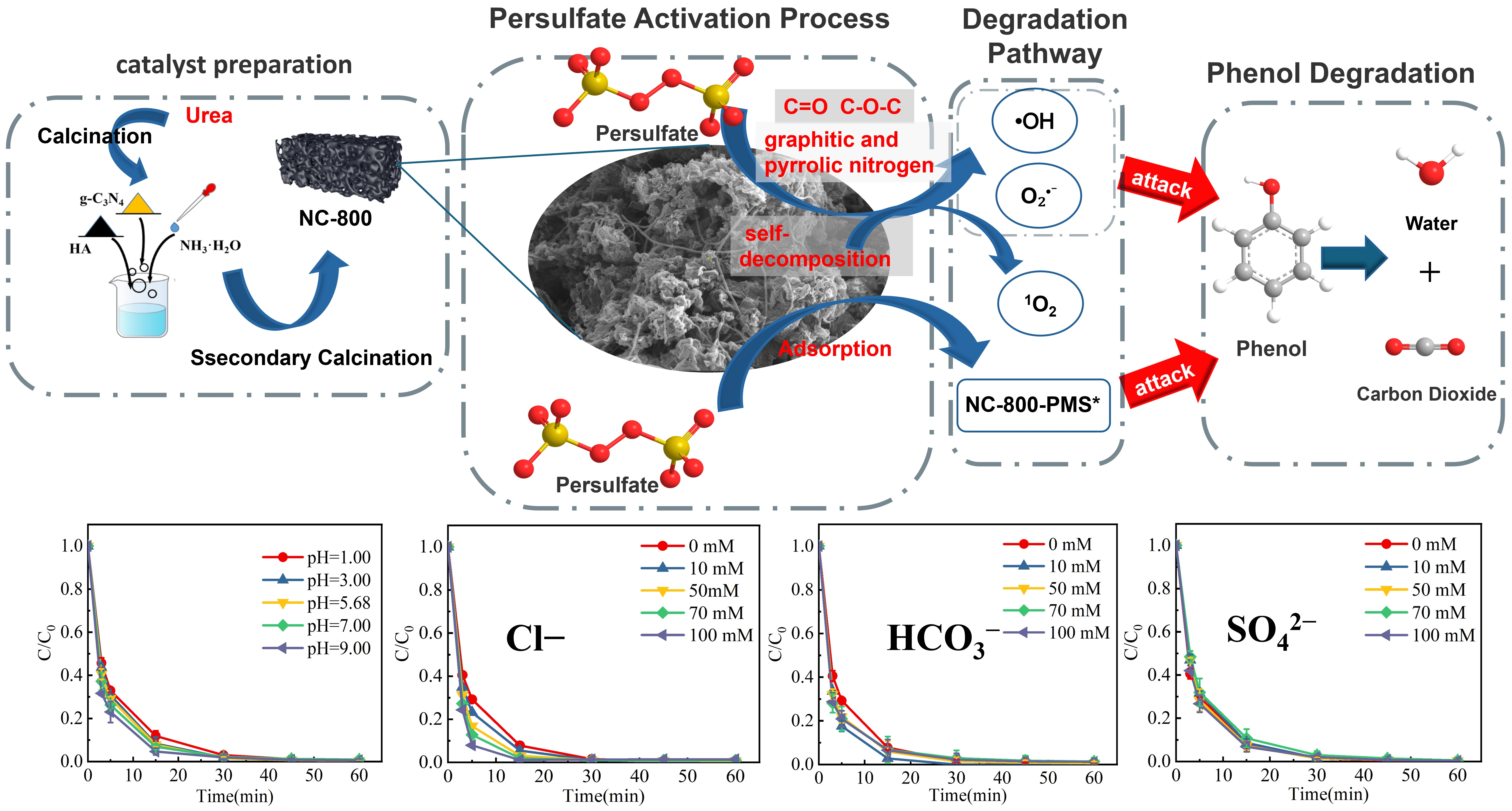 He, Q.; Wu, X.; Ma, P.; Wu, X.; Miao, Z. Synergistic Radical and Non-Radical Pathways in Phenol Degradation: Electron Transfer Mechanism Dominated by N-Doped Carbon/Peroxymonosulfate System. Catalysts 2025, 15, 968. https://doi.org/10.3390/catal15100968