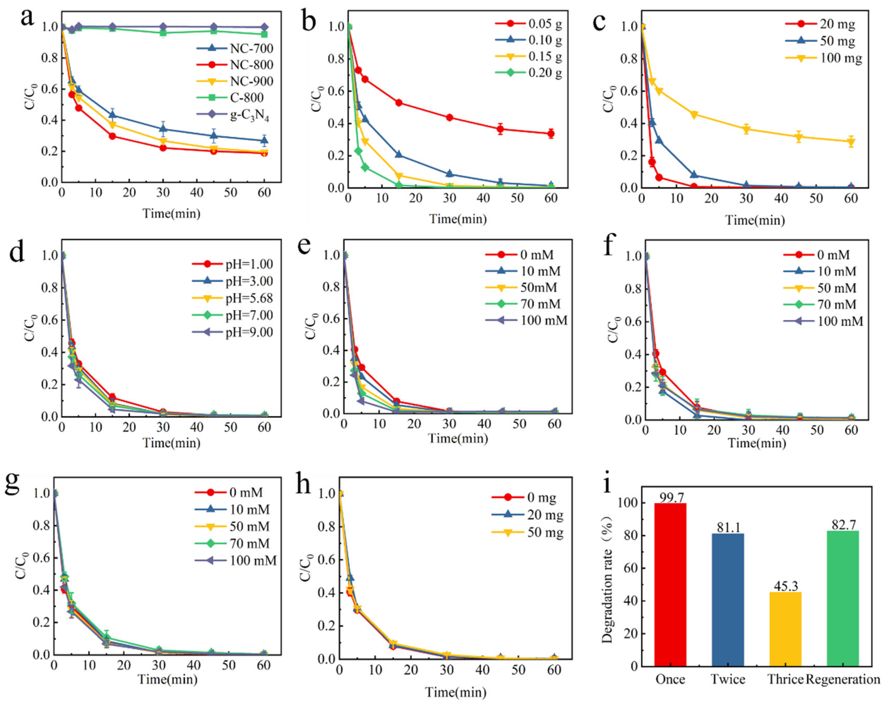 NC-800 | [PH] = 50 mg/L; [catalyst] = 150 mg/L; [PMS] = 1.5 mM | 0.1214 min−1 | 99.62% 60 min | 45.3% after the third cycle | This thesis |