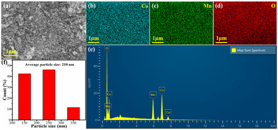 (a) SEM image of CoMn-LDO; (b–e) Corresponding EDS elemental mapping of CoMn-LDO demonstrating (b) cobalt, (c) manganese, (d) oxygen distributions, and (e) map sum spectrum; (f) particle size distribution of CoMn-LDO.