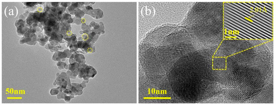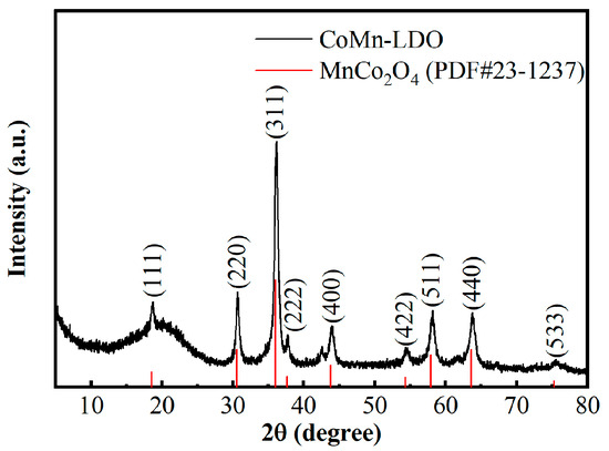 Figure 2 shows the XRD pattern of CoMn-LDO. The peak positions at 18.79–75.62° demonstrate perfect indexing with cubic crystal system planes, sequentially representing (111), (220), (311), (222), (400), (422), (511), (440), and (533) lattice orientations. These diffraction features match well with the standard reference pattern for MnCo2O4 (PDF#23–1237) [23], confirming the formation of hexagonal-structured MnCo2O4 after high-temperature calcination of CoMn-LDH. Additionally, the sharp and narrow diffraction peaks with high intensity indicate that the CoMn-LDO catalyst possesses high crystallinity and a well-defined crystal structure. To further quantify the crystallite size, the average crystallite dimension was calculated to be approximately 57.5 nm using the Scherrer equation (Equation (1)) [24]. This nanocrystalline size is consistent with the particle morphology observed by SEM (Figure 1a) and TEM (Figure 3a), wherein the catalyst exhibits loosely aggregated nanoparticles with sizes predominantly in the range of 100–300 nm. The discrepancy between the crystallite size and the particle size indicates that each particle is composed of multiple crystallites, which is typical for polycrystalline materials formed via calcination. The high crystallinity and small crystallite size contribute to the large specific surface area and abundant active sites of CoMn-LDO, thereby enhancing its catalytic performance.