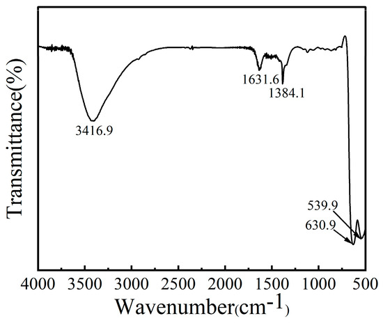 The functional groups of CoMn-LDO were characterized by FT-IR as shown in Figure 4. Compared to CoMn-LDH [10], the significant decrease in the infrared absorption peak at 3416.9 cm−1, corresponding to −OH stretching modes of hydrogen-bonded interlamellar water molecules [25], indicates substantial water evaporation during calcination. The absorption peak at 1631.6 cm−1 corresponds to the bending vibration of −OH groups from interlayer water molecules [26]. The peak at 1384.1 cm−1 arises from the vibration of NO3− ions in the interlayers of CoMn-LDO [27]. The spectral features between 400 and 700 cm−1 originate from characteristic vibrational modes, including both metal-hydroxyl bending (M–OH) and metal-oxygen stretching (M=O) excitations [28]. FT-IR analysis confirms the presence of NO3−, −OH groups, and H2O molecules in CoMn-LDO.