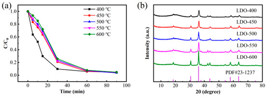 (a) Effect of calcination temperature on BPA degradation efficiency; (b) XRD patterns of catalysts prepared at different calcination temperatures (conditions: PMS dosage = 2 mmol/L, CoMn-LDO loading = 0.3 g/L, T = 25 °C, pH = 7.0, reaction volume = 100 mL of 50 mg/L BPA solution).